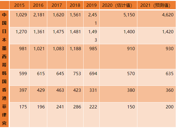 部分国家/地区猪肉进口量