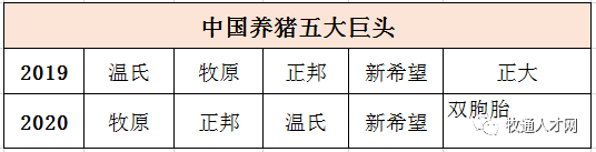前20强企业总共22家,年出栏生猪合计7808万头,相比2019年增长了26%,即1600万头。前五大巨头中,牧原由去年的第二上升到第一;正邦由去年的第三上升到第二,温氏则从去年的第一降到了第三;新希望依旧稳坐第四;与去年不同的是,双胞胎首次跻身前5强,排名第五。